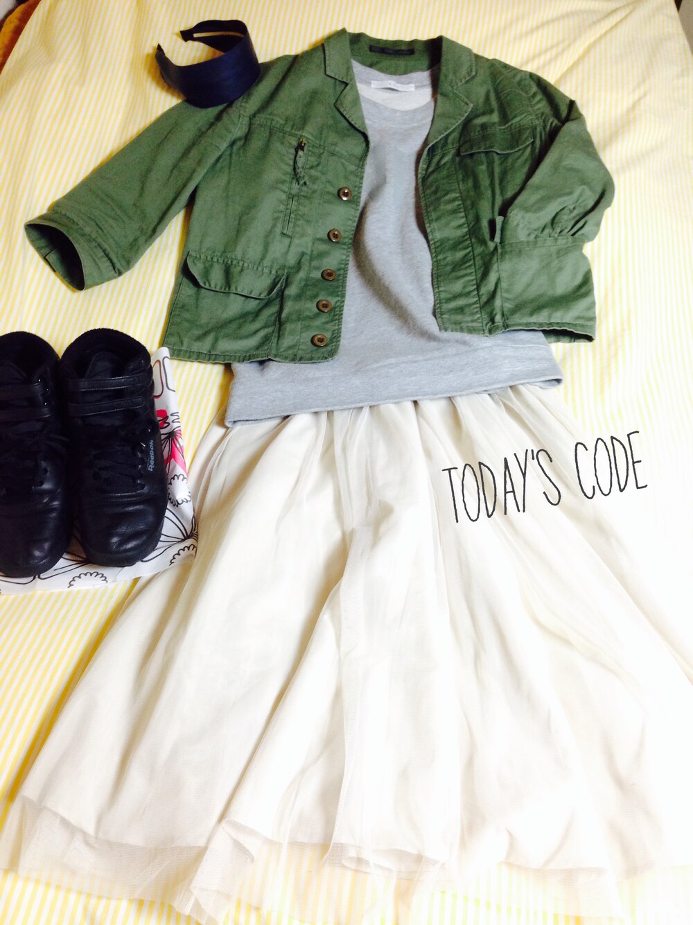 気分転換に買い物へ!!! カーキ×白の鉄板コーデにしました(・∀・)◎ でもやっぱりカジュアルが好きなので 足元はスニーカーで! ジャケット: heather スウェット: KBF スカート: KBF