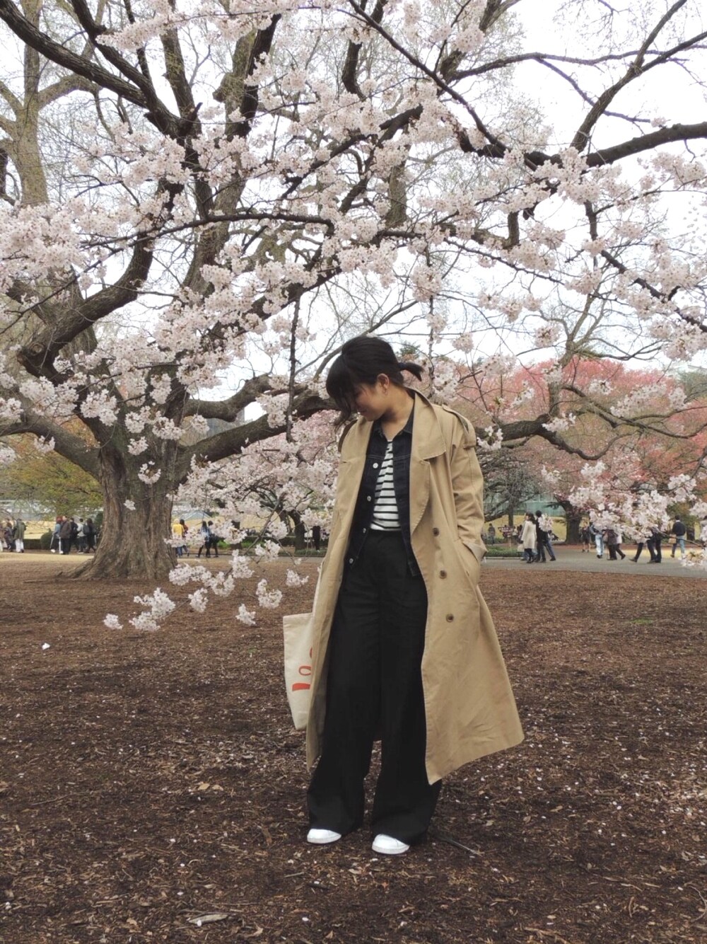 ありきたりな桜と一緒に撮影ってやつです。(笑) 肌寒いのでいまの時期にできちゃうデニムジャケット×トレンチコート