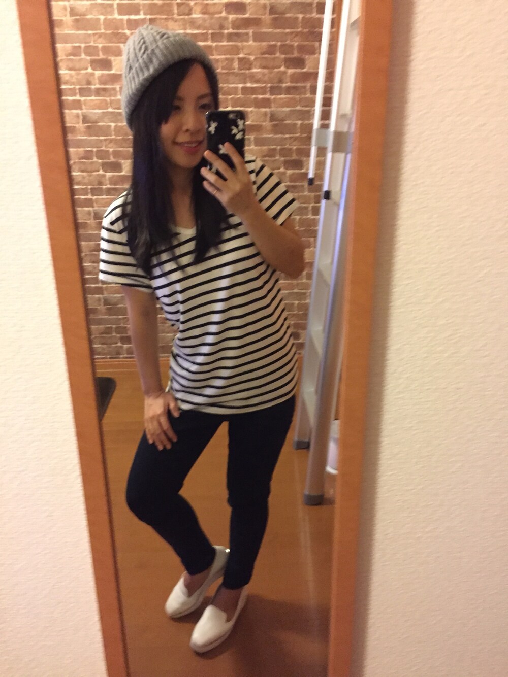 MoussyボーダーVネックTシャツが購入 細身に見えるので、気に入りです✨ ビーニーは去年購入したもの:)