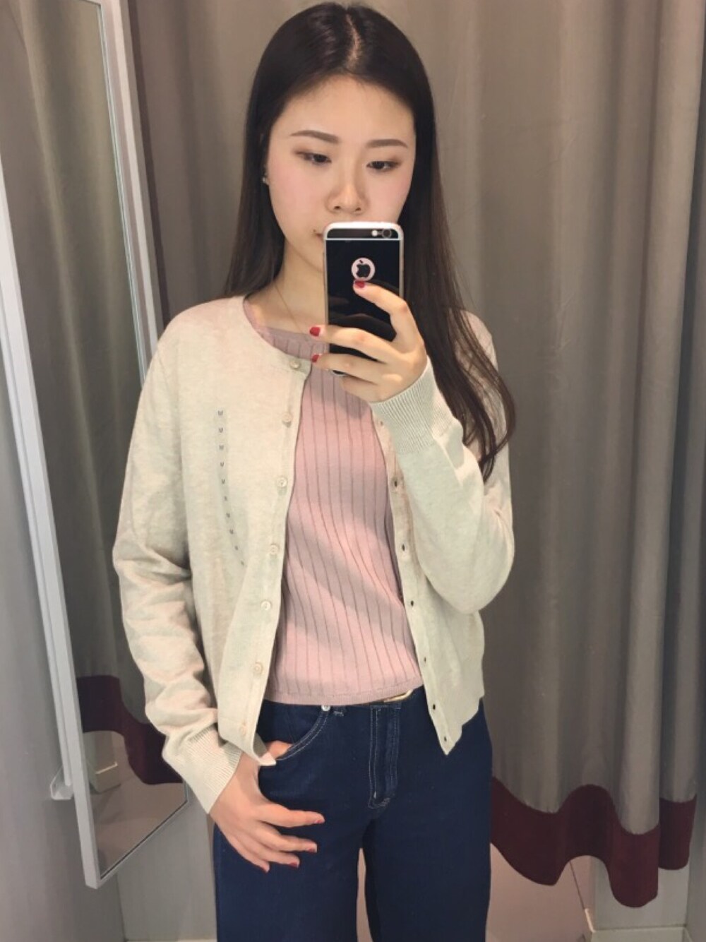 ベージュ系のカーディガン/ボレロ、ベージュ系のカーディガン/ボレロ、ブルー系のデニムパンツを着用したレディースの秋コーディネートの1枚目の写真