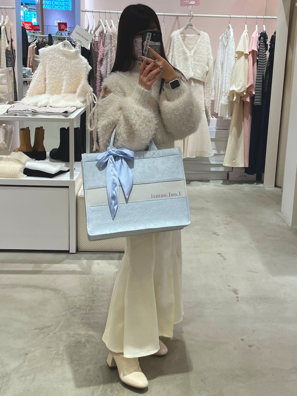 150cm 22.5cm 骨格ウェーブ 【ニット】サイズ/フリー 肩リボンになっていて リボンで空き具合を調整できるニット 全開ももちろんかわいいですが 私は極度の寒がりなので 5-6cm程開けて着るのがベストで 同じ方にはおすすめします◎ 【スカート】サイズ/ S着用 フロントにスリットが入っている分 歩幅の許容範囲も広いし、 自転車も乗りやすいのでマーメイド履きたくてもそこで悩んでしまう方におすすめしたい❤︎ 後ろもゴムになってて楽だし リボンもまたさり気なくかわいい!! 【バッグ】 オタ活グッズの1つのトートバッグ ほんとに大容量だし内ポケット全側面にあって もう感動の嵐!!! ペンラ5本以上常連の私は それプラスで荷物があるので もちろん買いました❤︎
