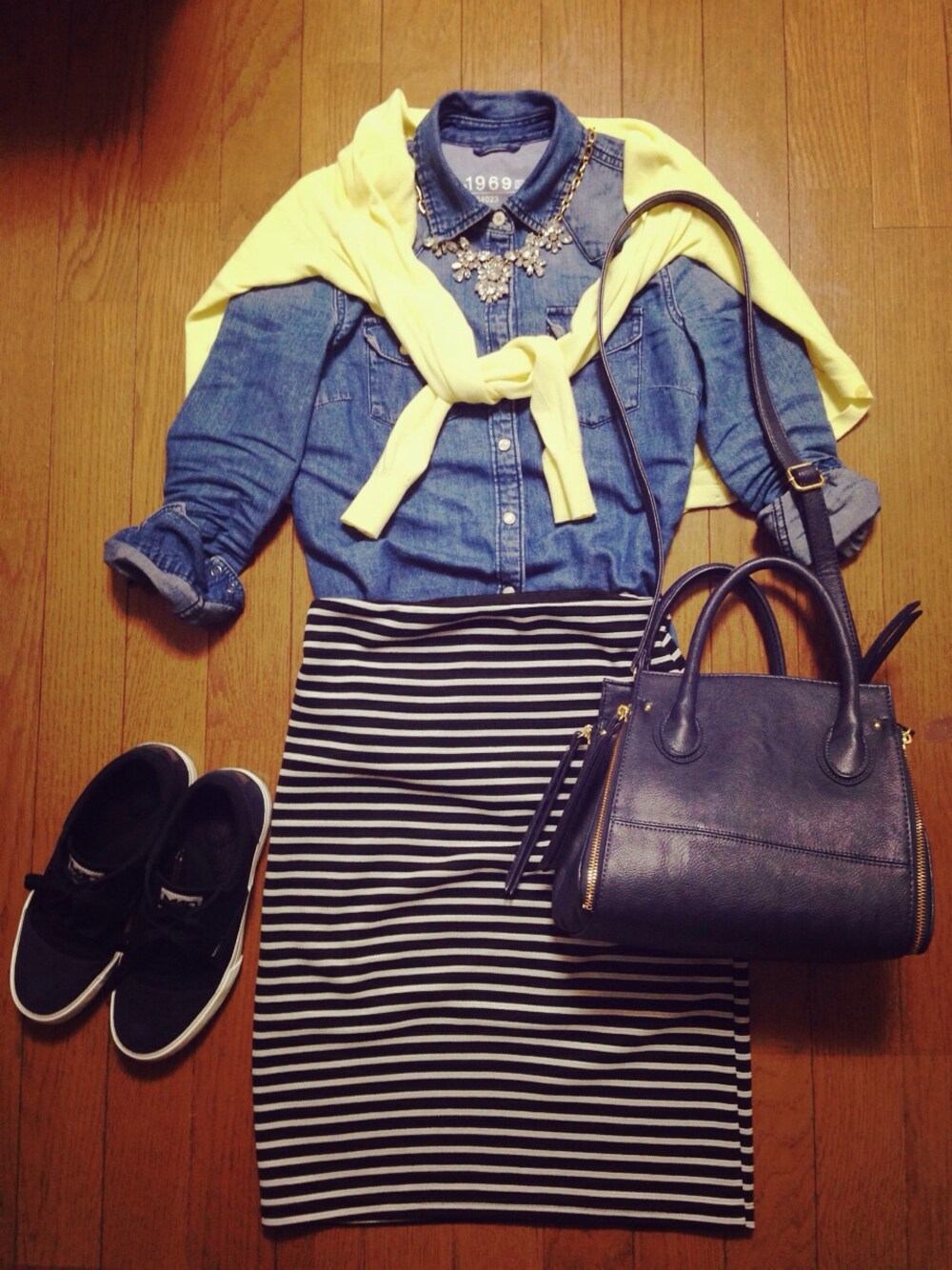 イエローのカーディガンをアクセントに。 スニーカーもネイビーです! 最近、ヒールが履けなくなってきたな꒰ *‾ʖ̫‾ ꒱