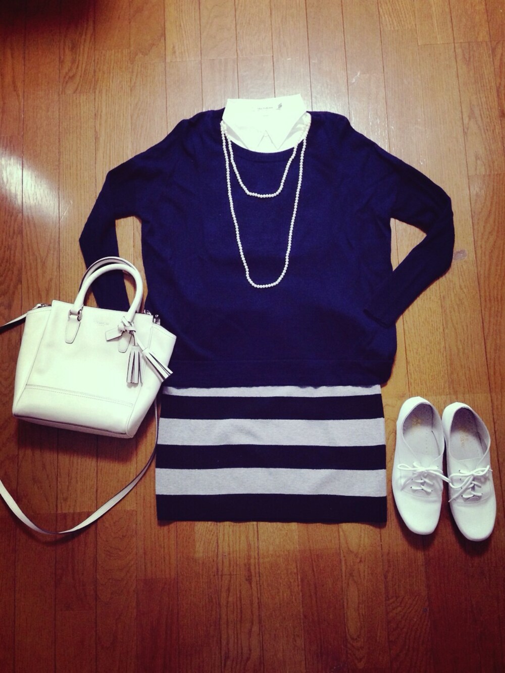 ちょっと肌寒かったのでニットを。 ビジューネックレスとロングパールで悩みましたが、最近つけてなかったパールをセレクト♡