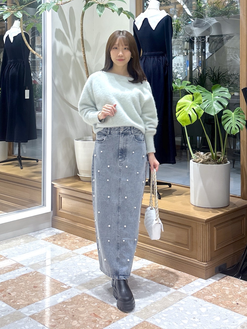 【トップス】 大人気ヘアリーシリーズ♡ ふわふわで気持ちいい着心地で、しっかり暖かいです! オフショルとしてもボートネックとしても着用出来ます〇 【デニム】 大人気デニムスカートが再登場! パールモチーフでキレイめ好きさんにもおすすめ〇 長めの丈感なので大人っぽい印象に〇