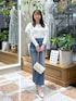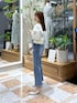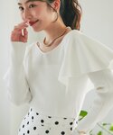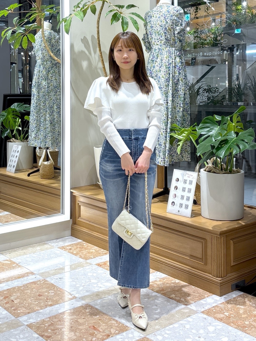 【トップス】…ホワイト ラッフルフリルが華やかなニット 肩周りのフリルと、首周りはスッキリなデザインで華奢見え抜群◎ 【ボトムス】…サックス/38サイズ 履くだけで痩せたと錯覚するほどに着痩せするデニム!! ストレッチも効いていて、動きやすさもバッチリです◎ バックレースアップで後ろ姿も綺麗です