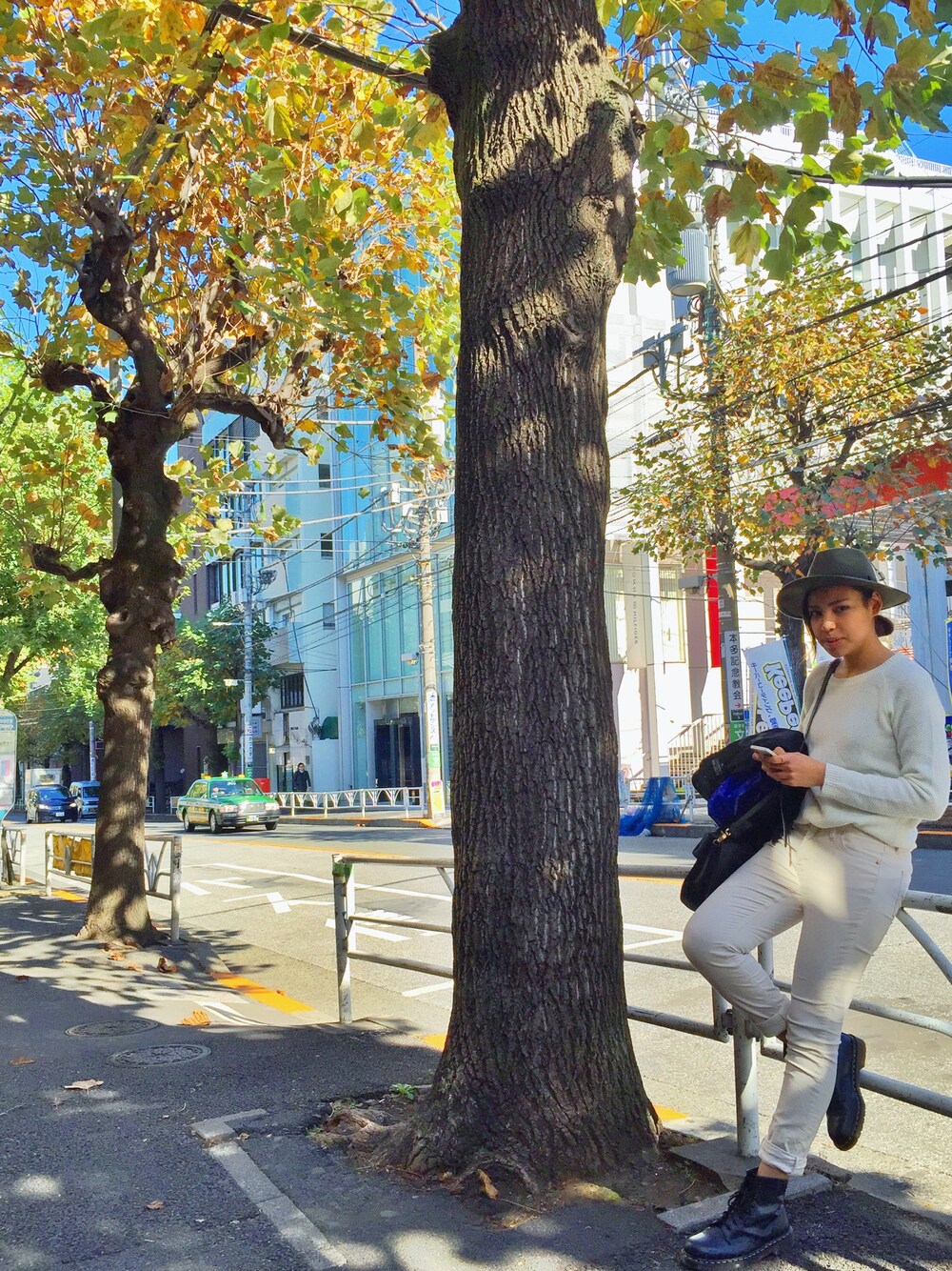 オールホワイトにグリーンハット&ネイビーマーチン。