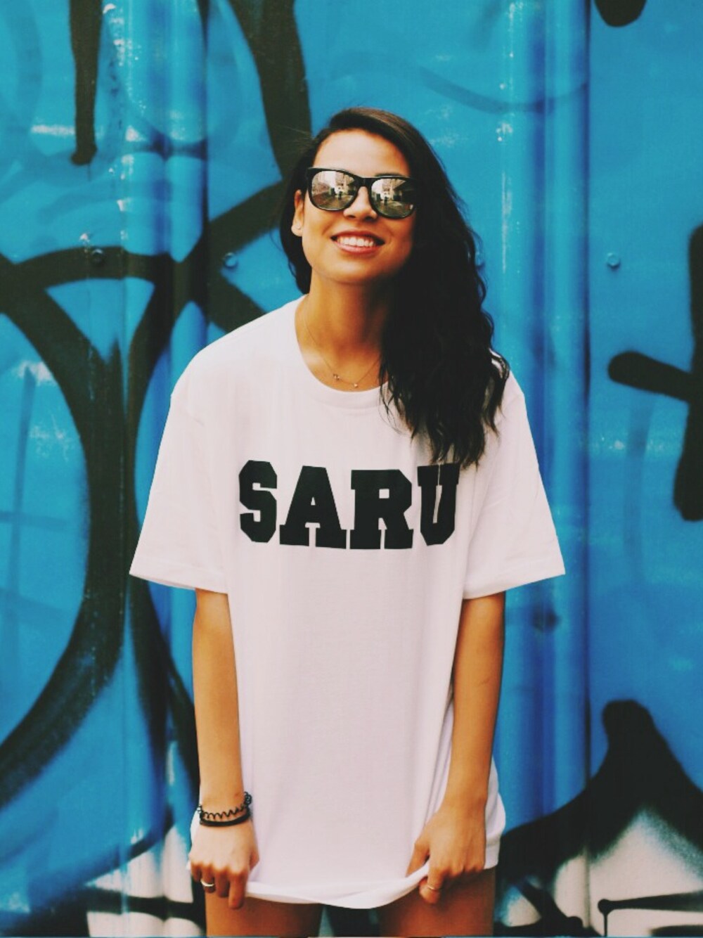 Santastic!の定番ロゴSARUのTシャツをXLサイズで着用。 下に何も着てないようで見えそうで見えない感が可愛い! これにちょっと派手なハイテクなキックス履くとばっちり☆