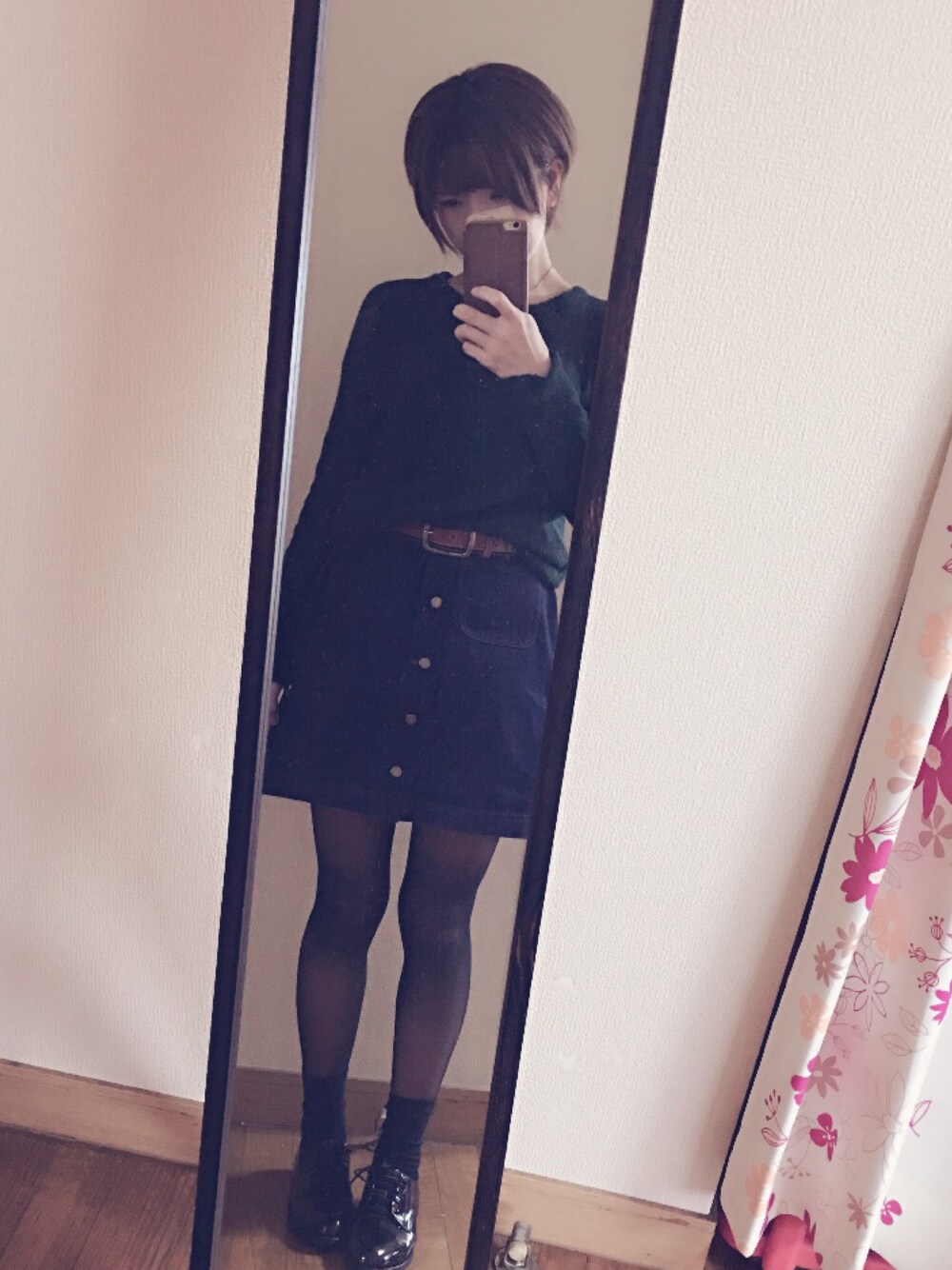 スカートのサイズが緩くて長かったのでベルトで締めて隠す作戦 わかりずらいですが、グリーンのニットです。 ソックスはたまたま家の中でちょうど良いの見つけました。⇦ 良く見たら無印のLR靴下ヽ(;▽;)ノ笑