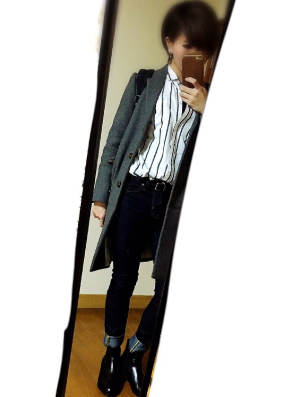 10月から欲しかったとつぶやいていたまま買わずにいたストライプシャツを入手したのでハンサムにしてみました(`_´)ゞキリッ 履いていたサイドゴアブーツが壊れてしまい新調したところ形がカッコイイ!+少しヒールがあるので良い感じです。ヒール久々です。← これだとわかりずらい…。
