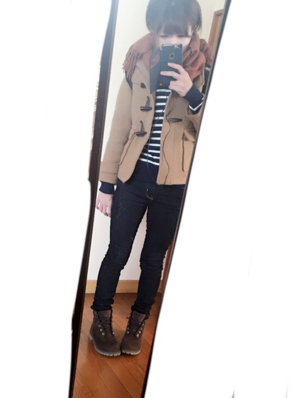 結局前髪を切るという…。意思が弱い。笑 見えないですがデニムシャツにボーダーニットです。 久々にダッフルコート☺️ TimberLandのブーツを購入したので合わせたいコーデが色々浮かぶ