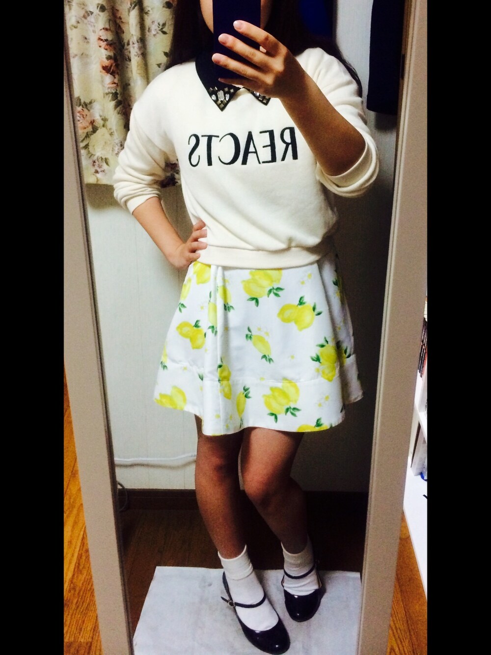 12/4/2014 op : titty&Co. shirt : RETRO GIRL sweat : INGNI スウェットに書いてあるreacts。 [反応する]という意味ですが、何に反応すればいいのかこちらが反応に困ります。 全身白コーデです。膨張色の白。膨張。 絶賛膨張中です。 シースルーソックスかラインソックスにすればよかったかなー(´・ω・`)