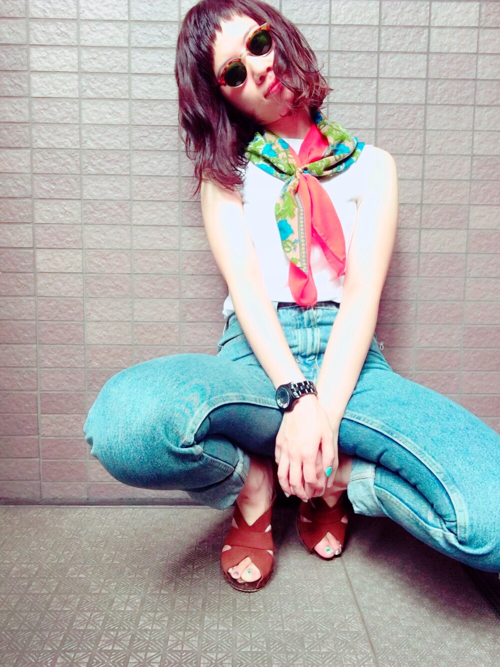古着屋さんめぐりの日\(^o^)/ ドルガバのタンクトップは京都の古着屋さんでゲットしました♡♡後ろにさりげなく"D&G"のプリントが入ってるから、わかる人にはわかる!みたいな感じです。(笑) 白タンク×デニムだけじゃシンプル過ぎるな〜と思い、まだオトナじゃないあたしは派手柄スカーフで自分らしく☆彡いつもは結んでるけど今日は指輪に通してみました〜 そして古着屋さんでは気になってたチャイナ服をゲットしました!着るの超たのしみ✌︎✌︎