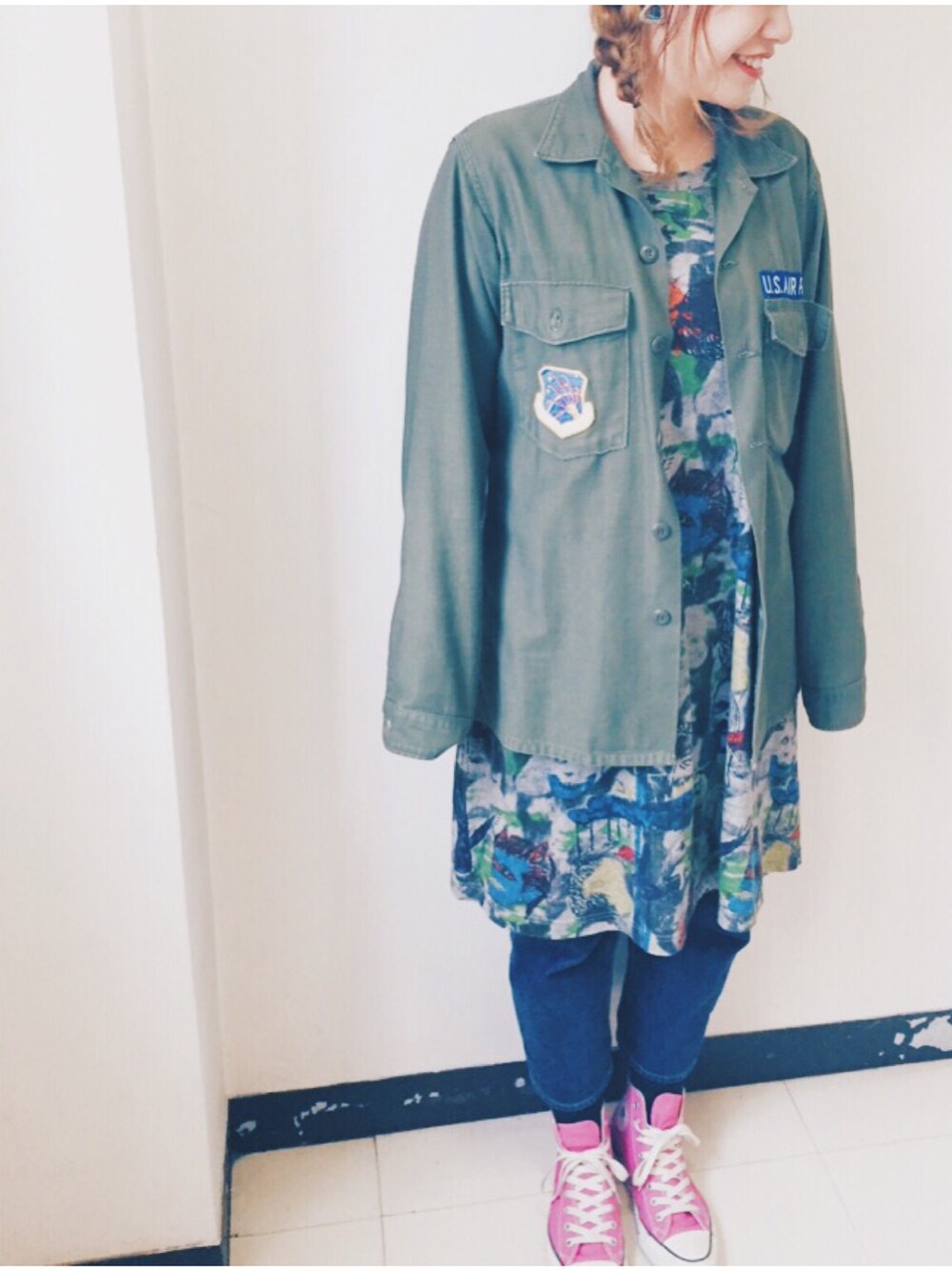顔がいっぱいワンピースに ミリタリーシャツにおさげ🎀 instagram → AYMI_5