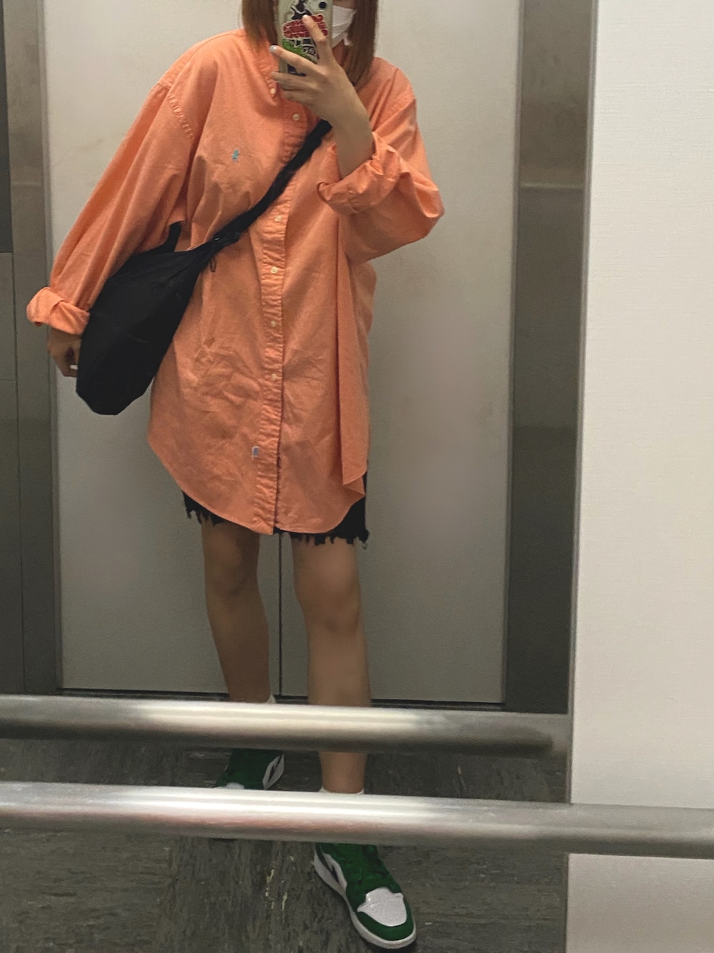 ピンクのようなオレンジのような絶妙なカラーのラルフシャツ‼️ XXLで超オーバーだけどそれが可愛い〜💞 ロゴの刺繍が水色なのが絶妙で最高😮💨💦 シャツは古着屋さんで購入しました🫶🏼