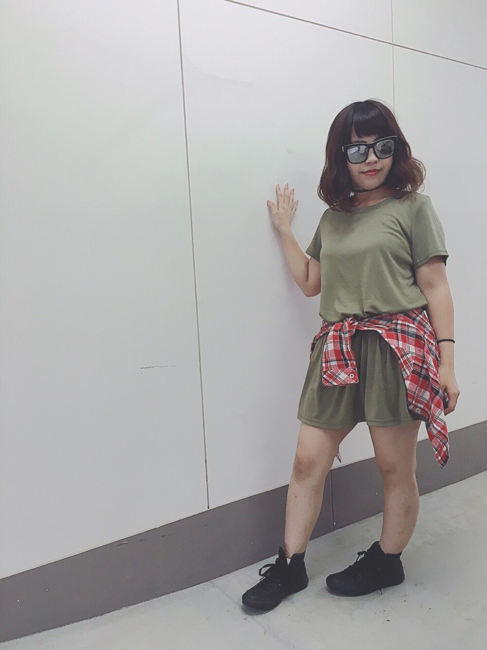 GRLのワンピース届いたけど チビな私にはデカすぎた😫😫😫(笑) だからチェックシャツを腰に巻いて ミニにしてみたらとてもいい感じ〜😇👍 調子に乗ってサングラスかけたけど やっぱり似合わない😎