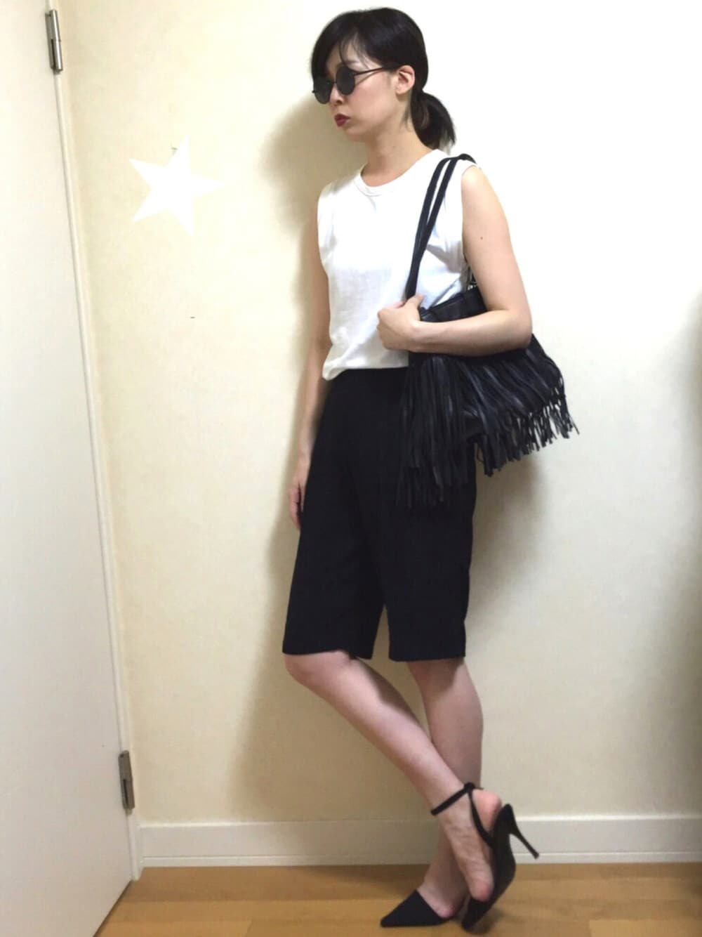 バミューダパンツで メンズっぽくなりがちなコーデに ヒールで女性らしさも忘れずに〜 後はトレンドのフリンジをプラス♪ バッグの持ち方に違和感が。笑