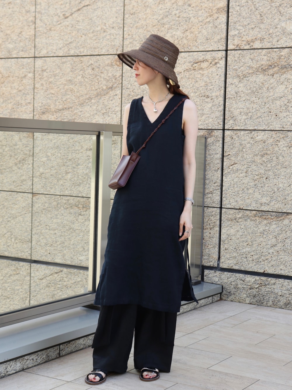 上下リネン素材のお洋服に透け感のある ペーパーキャペリンを合わせました🫶🏻 高さのあるクラウンが気分です✨
