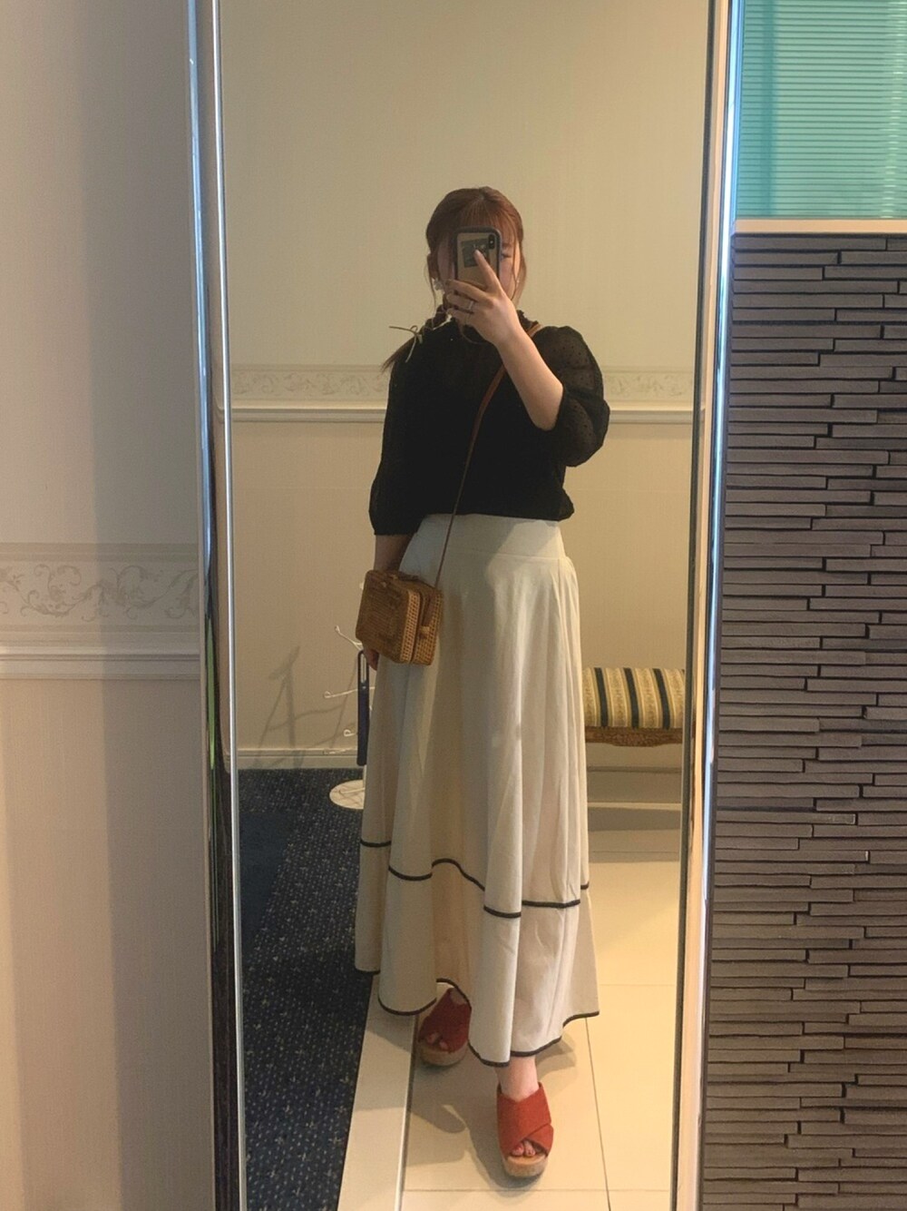 このスカートめちゃくちゃ可愛くてお気に入り!撮り方めちゃ下手くそで全然可愛さ伝わらへんのが残念です、、 髪の毛は紐アレンジしてます☺️