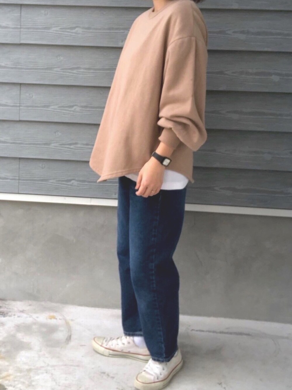 beige×denim▶︎▶︎▶︎ ラウンド型した裾がかわいいよ! 横から少しのぞくinnerがいい! インスタ更新中!