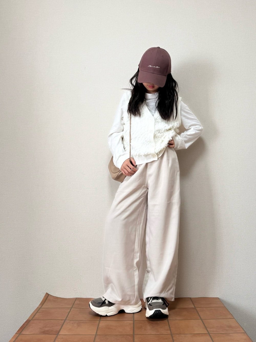 ✔️録り溜めです、 白基調のワントーン🤍🤎 ふわっふわの白の フリンジのベストが お気に入りです𓂃♩