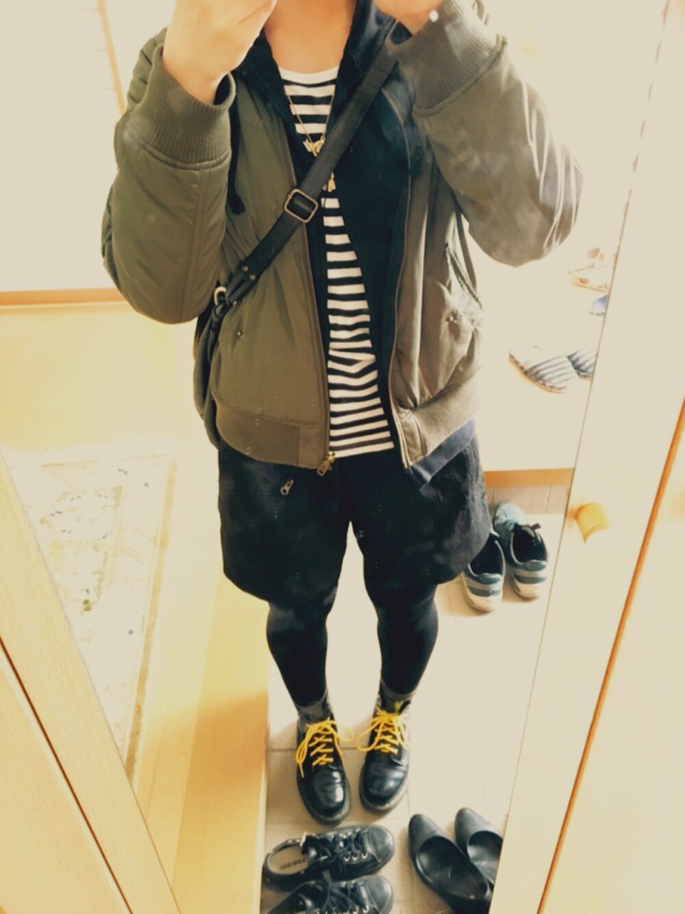 おひさしぶりの さいきんはカーキと黒ばっかり着てます 黄色の靴紐でもかわいい