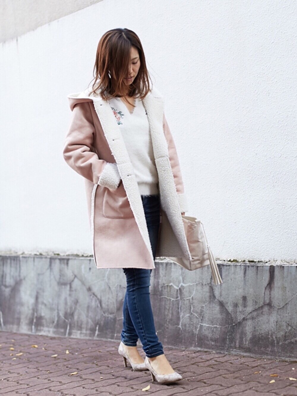 ロングコートを主役にした 大人の休日スタイル👩🏻 今、ハマってる ふわふわシャギーニットに 刺繍入りが💓 ピンクのムートンコートも珍しくて可愛い😳 トップが甘くなったので 足元はデニムとパイソンのパンプスで カジュアルダウンしました🐣