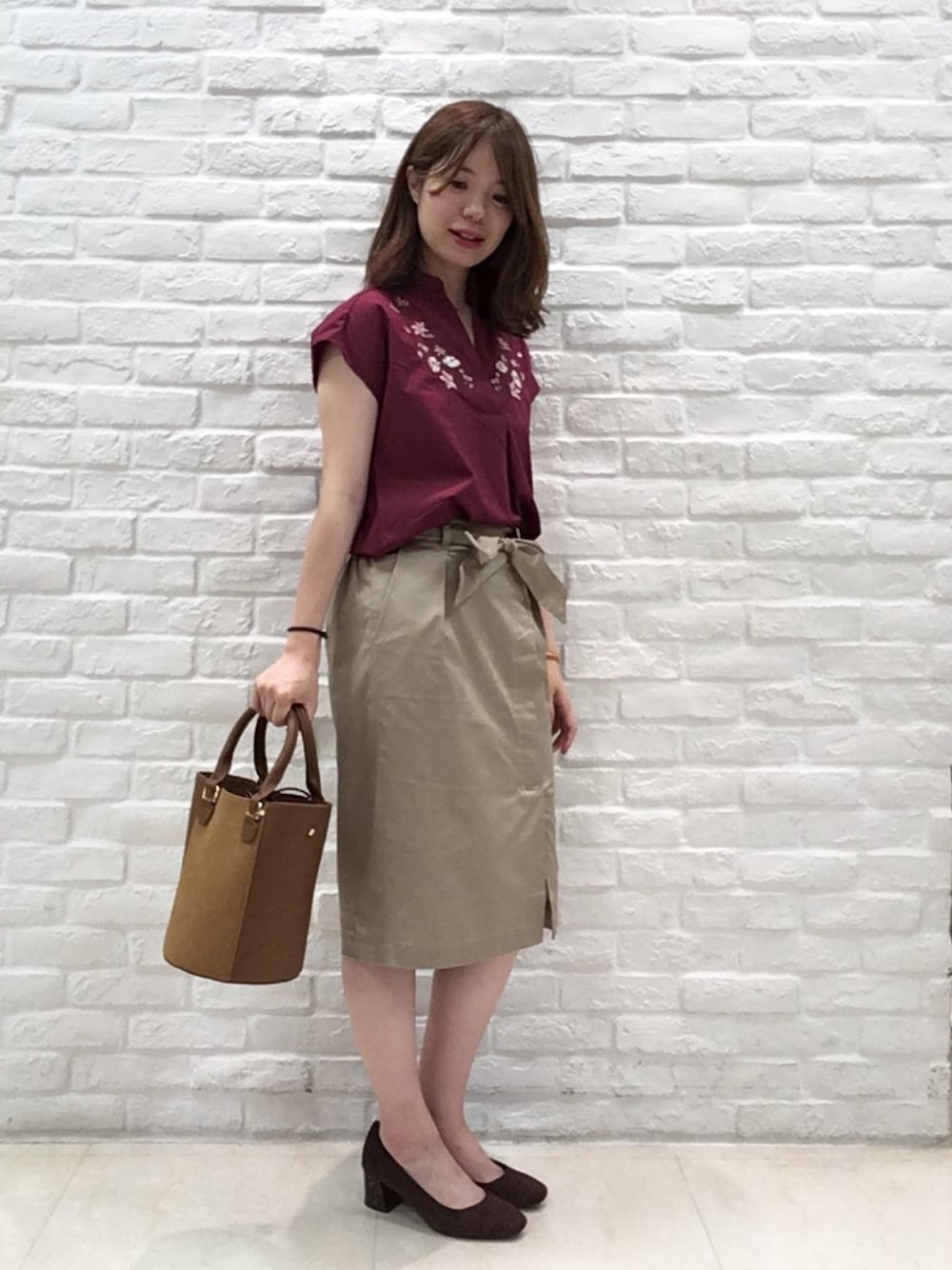 秋カラーコーデ👗👠 一枚で主役級の刺繍ブラウスはまだまだ人気アイテム✨ ボルドーは大人の色気が出るエレガントなカラーですね♪ 新作のパンプス、ヒールに柄があっておしゃれです😍😍