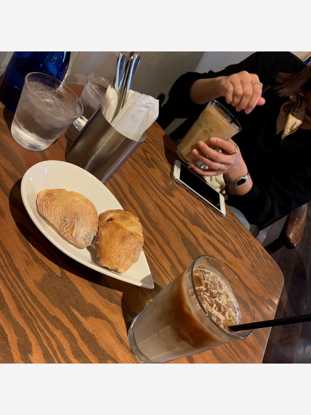 ブラックワッフルティシャツにブラウンスカーフがお気に入り。