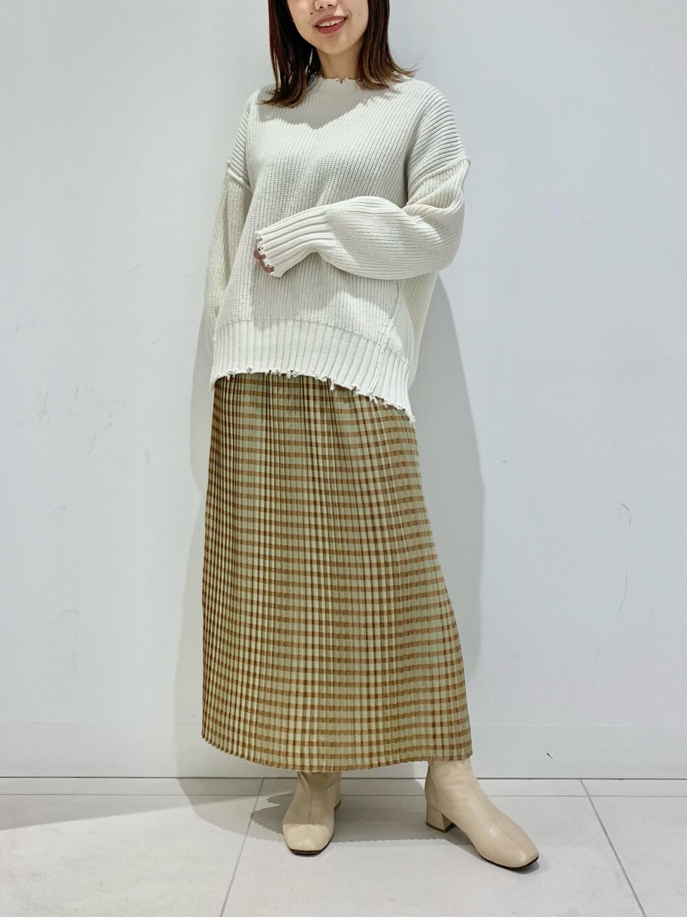 チェックプリーツスカート は広がりすぎないシルエット なので合わせやすくて可愛い です◎ ダメージニットはどの色も 可愛いですよ🥝 Instagram a_k_a_0711