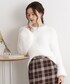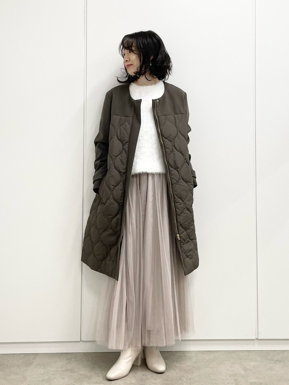 【ふわふわシャギーニットの優しげコーデ】 白いアイテムを着たくなるこの時季におすすめコーデ。 幼くならないように、アウターは落ち着きのあるカーキをチョイス。 ふんわり揺れるチュールスカートもポイントです。