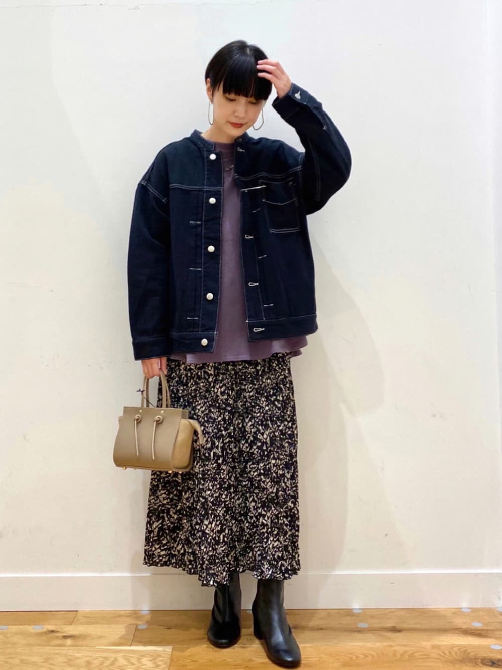 秋山 里織のデニムジャケット「FORK&SPOON 接結デニムノーカラージャケット」を使ったコーディネート