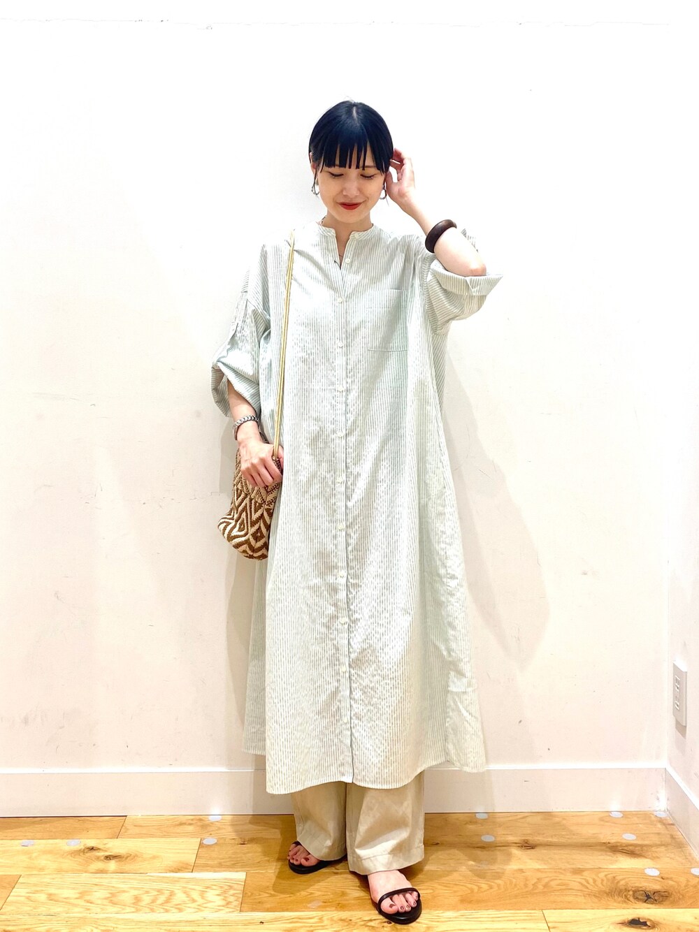 秋山 里織のワンピース「スタンドカラーストライプワンピース」を使ったコーディネート
