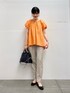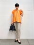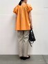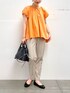 ブラウスはボリューム感のある袖のデザインがポイントに◎ オレンジのカラーもきれいで、顔まわりを華やかに見せてくれます♩ 後ろにかけてやや長くなる丈感で、おしり周りもカバーできます! パンツはセンターラインが入っていて足をすっきり見せてくれます◎ ウエストゴムでとても楽な履き心地です♩ 丈は身長158㎝でちょうど良い丈感でした!