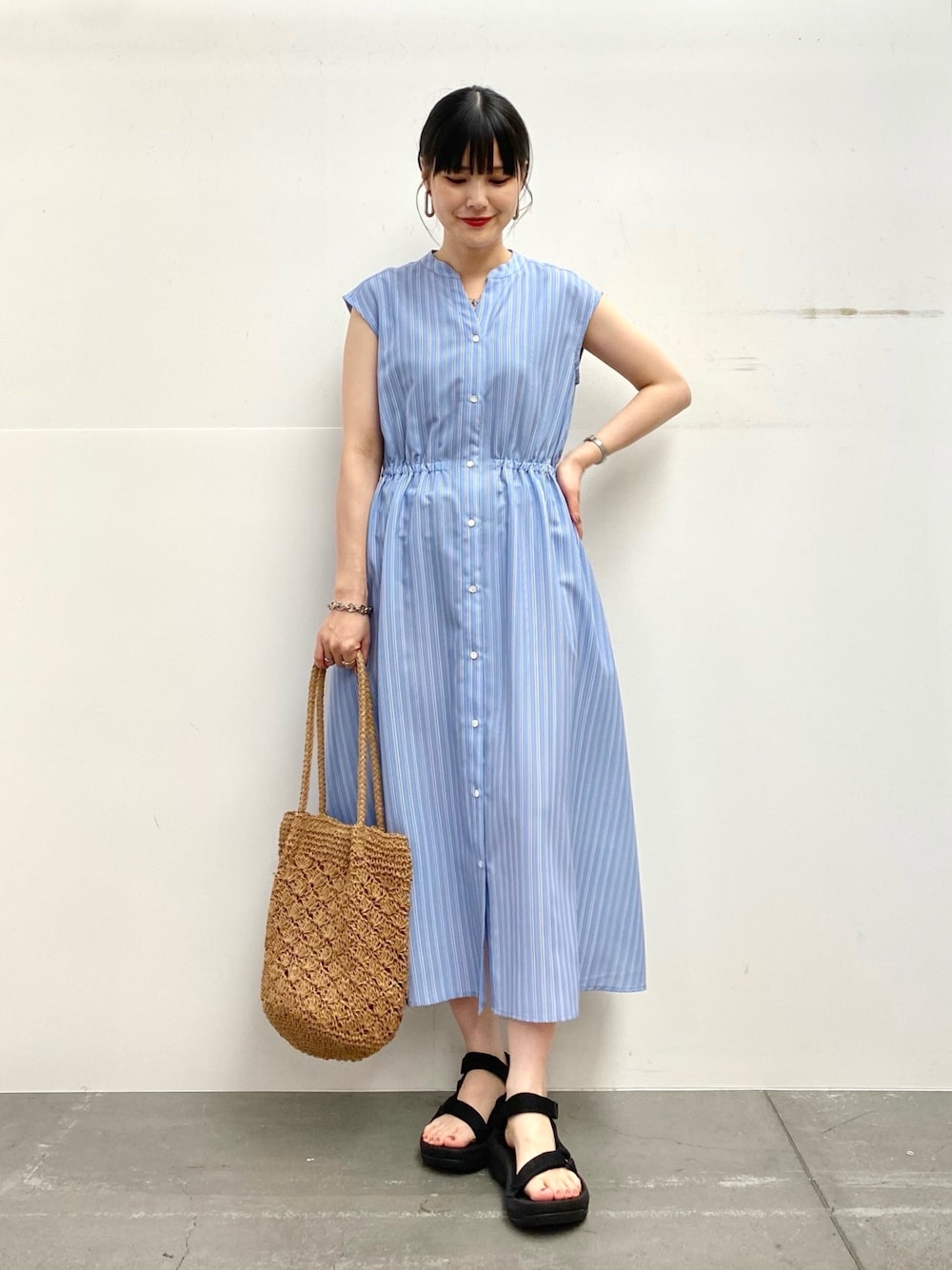 ワンピースはウエストがゴムなので、メリハリのあるデザインですがとても楽にお召しいただけます◎ 爽やかなブルーのストライプが夏らしいお出かけのシーンにぴったりです♩ 肩が隠れるくらいの袖丈でノースリーブよりも着やすく、抜け感のある首元のデザインがすっきりとした印象に。 ボタンを開けて着るとジレのような羽織としてもお召しいただけます! 透け感は気にならず1枚でさらっとお召しいただけます◎