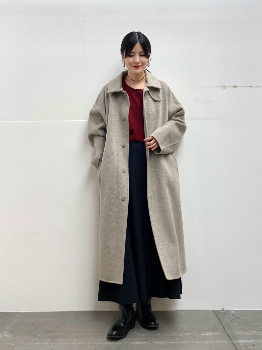 秋山 里織のステンカラーコート「ウールステンカラーコート」を使ったコーディネート