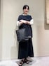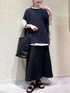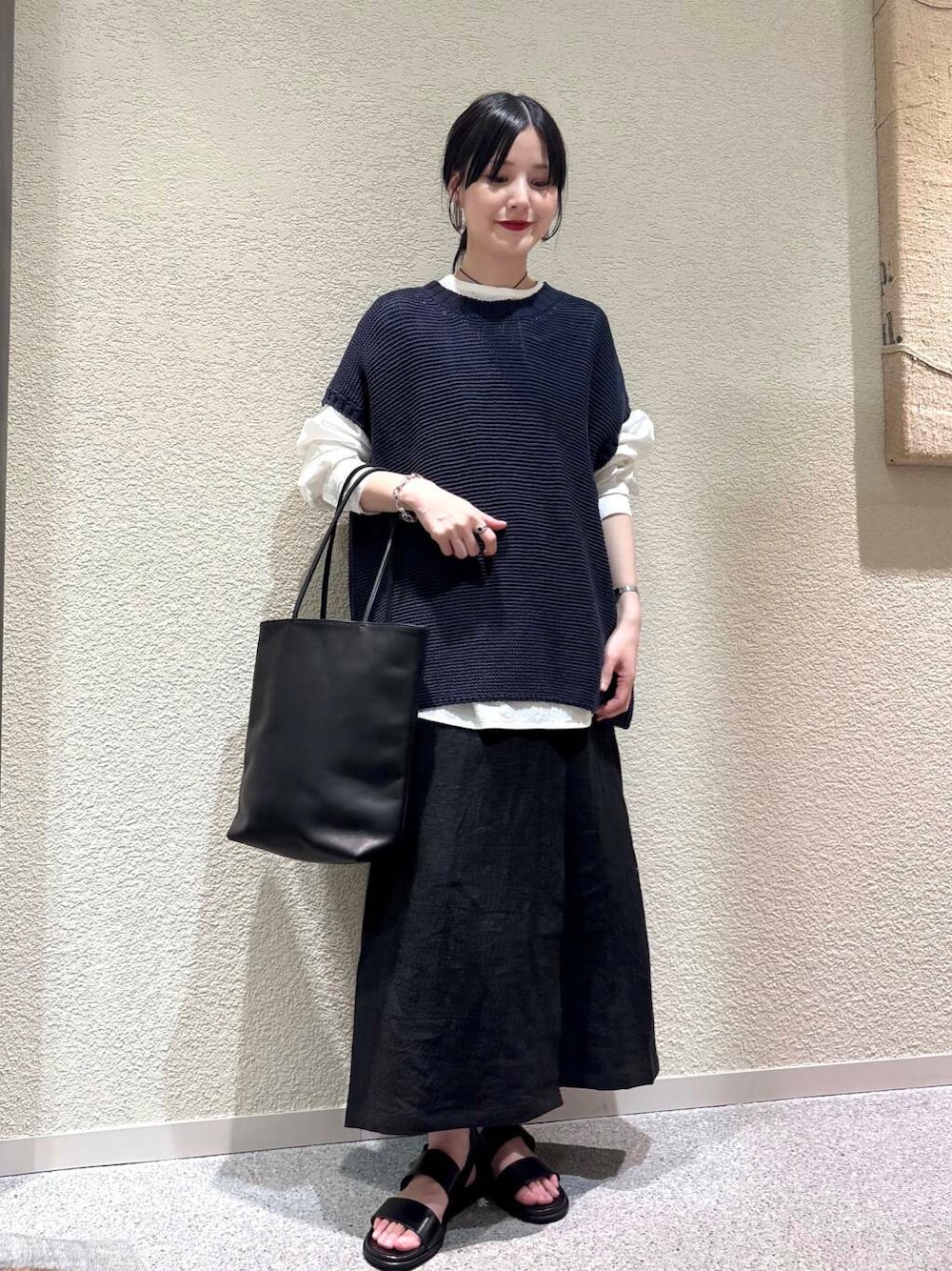 【トップス】 シルク混ならではの上品なハリと軽やかさがあり、肌に優しく、きれいめな印象に◎白のクリーンなカラーがスタイリング全体のベースになっています。 【ニットベスト】 ざっくりとした編み地と落ち感のあるシルエットが、白プルオーバーに奥行きと立体感をプラス。ネイビーを選ぶことで、黒よりも少し柔らかい印象にまとまります♩ 【ボトムス】 ラップデザインならではの動きのあるシルエットと、リネンラミーのナチュラルな質感が絶妙にマッチ。ブラックで引き締めつつ、素材の軽さで重たく見せません◎ 【バッグ】 ミニマルで高級感のあるデザインが、全体のカジュアルさにきれいめな大人っぽさを加えています。 【シューズ】 フラットで無駄のないデザインが、スカートの軽やかさを引き立て、コーディネートをすっきりとまとめてくれます♩ 【スタイルまとめ】 「ナチュラルな質感ときれいめ要素をバランス良く融合させた、大人の上質カジュアル」。上質な素材感を活かした、洗練された大人のモノトーンスタイルです!