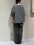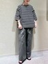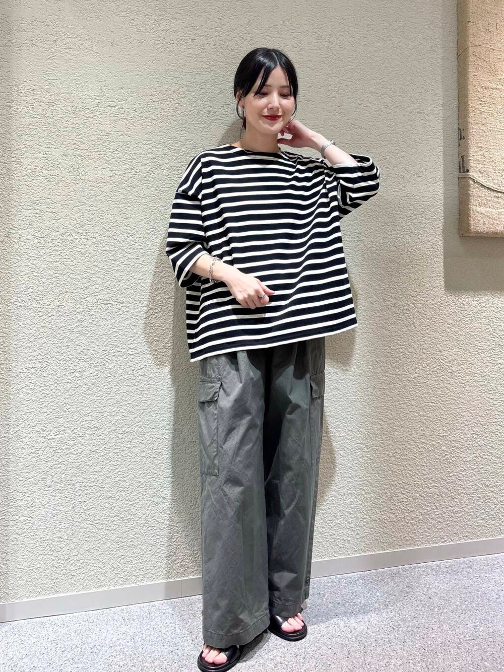 【トップス】 黒ベースに白のボーダーがしっかりとしたコントラストを作り、シンプルながら存在感のあるデザイン。ワイド&5分袖で抜け感があり、袖が肘にかかるくらいの長さがラフすぎずバランス◎ 【ボトムス】 サイドポケットのデザインが立体感を出し、実用性もありながらアウトドアやワークっぽいニュアンスをプラス。スモークカーキがボーダーTのモノトーンに柔らかさと深みを加え、ミリタリーっぽいニュアンスも感じさせます♩ 【シューズ】 黒のシンプルなストラップ付きサンダル。足元はスッキリ&シンプルに、踵のストラップが安定感と少しスポーティな印象をプラス。黒で統一感を持たせ、全体の色バランスを締める役割も。 【スタイルまとめ】 ゆったりとしたシルエットで動きやすく、程よいカジュアルさと都会的なムードが漂う、ユニセックス感のあるスタイルです◎アクティブでカジュアルだけど、シルエットと配色で大人っぽさ・クールさが際立ちます!ちょっと街歩きやアウトドア、カフェなど幅広いシーンに馴染む万能スタイルです♩