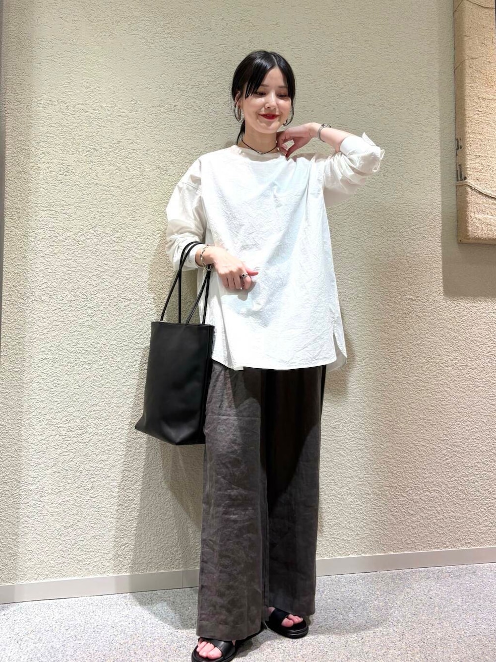 【トップス】 程よいオーバーサイズが魅力のホワイトシャツは、ゆったりとしたシルエットで抜け感を演出しつつ、上品さも忘れないデザイン。 【ボトムス】 リネン素材のダークトーンのワイドパンツは落ち感が美しく、スタイルアップ効果も◎ 【シューズ】 足元はシンプルなブラックサンダルで抜け感をプラスし、全体をバランスよくまとめています。黒のトートバッグが引き締め役となり、都会的で洗練された印象に。 【アクセサリー】 アクセサリーはシルバー系で統一し、カジュアルながらもきちんと感をプラス。 【スタイルまとめ】 リラックス感とモード感を両立する、大人のカジュアルスタイルです♩