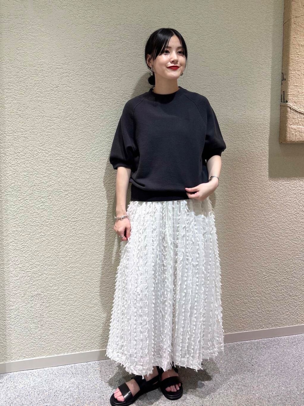 【トップス】 ふっくらとした肉感のある素材が特徴の、ラグランスリーブの半袖スウェット。肩まわりが自然に落ちるシルエットと、ほどよいボリューム感で、リラックスした着心地ながらこなれ感のある印象に。やや短めの着丈が、ボリュームのあるボトムとも好相性。 【ボトムス】 合わせたスカートは、全体にフリンジ加工を施した白のふんわりと広がるフレアシルエット。歩くたびに揺れる表情豊かなデザインが、シンプルなトップスと好対照で、コーディネートに華やかさと動きを添えます。 【シューズ】 足元には黒のフラットサンダルを合わせて、引き締めと抜け感を両立。 【おすすめポイント】 • ラグランスリーブ&しっかり厚みのあるスウェットでこなれた存在感 • フリンジが印象的な白のフレアスカートで動きのある華やかさをプラス • カジュアルとフェミニンのバランスが絶妙なmixスタイル • モノトーン配色で甘さ控えめ、洗練された大人の印象に • フラットサンダルで足元に抜け感と軽やかさをプラス 【こんな方におすすめ】 • カジュアルアイテムをきれいめに着こなしたい方 • 動きのあるディテールや素材感で差をつけたい方 • 甘すぎない大人のフェミニンスタイルを楽しみたい方