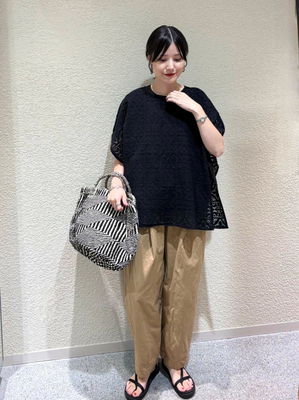 【トップス】 繊細なレースが目を引くポンチョ型のプルオーバーは、涼しげでありながら女性らしさを引き立てる1枚。 たっぷりとしたシルエットは風をはらんで軽やかに揺れ、肩まわりを美しく包みます。 黒のカラーが肌の透明感を際立たせ、甘すぎずモードな印象に。 【ボトムス】 ややゆとりのあるシルエットがリラックス感を生み出す、コットン素材のクロップドパンツ。軽やかな丈感で足元がすっきり見え、トップスとのバランスも◎ やさしいベージュカラーがレーストップスのブラックを程よく中和し、ナチュラルにまとめてくれます。 【バッグ】 スタイリングをぐっと引き締めてくれるブラックのサイザルバッグ。素材の立体感と丸みのあるシルエットが、ナチュラルさとモード感を絶妙に両立。 ブラックのレーストップスとのリンクで、上品なまとまり感が生まれます。 ✔️スタイリングポイント • ブラック×ベージュのメリハリ配色で大人の余裕を演出 • ポンチョ型のレーストップスが、ラインを美しくカバー • クロップドパンツで抜け感をプラスし、身長158cmでも重たくならないバランスに • サイザルバッグの風合いが、夏らしいナチュラルさと都会的な洗練を両立