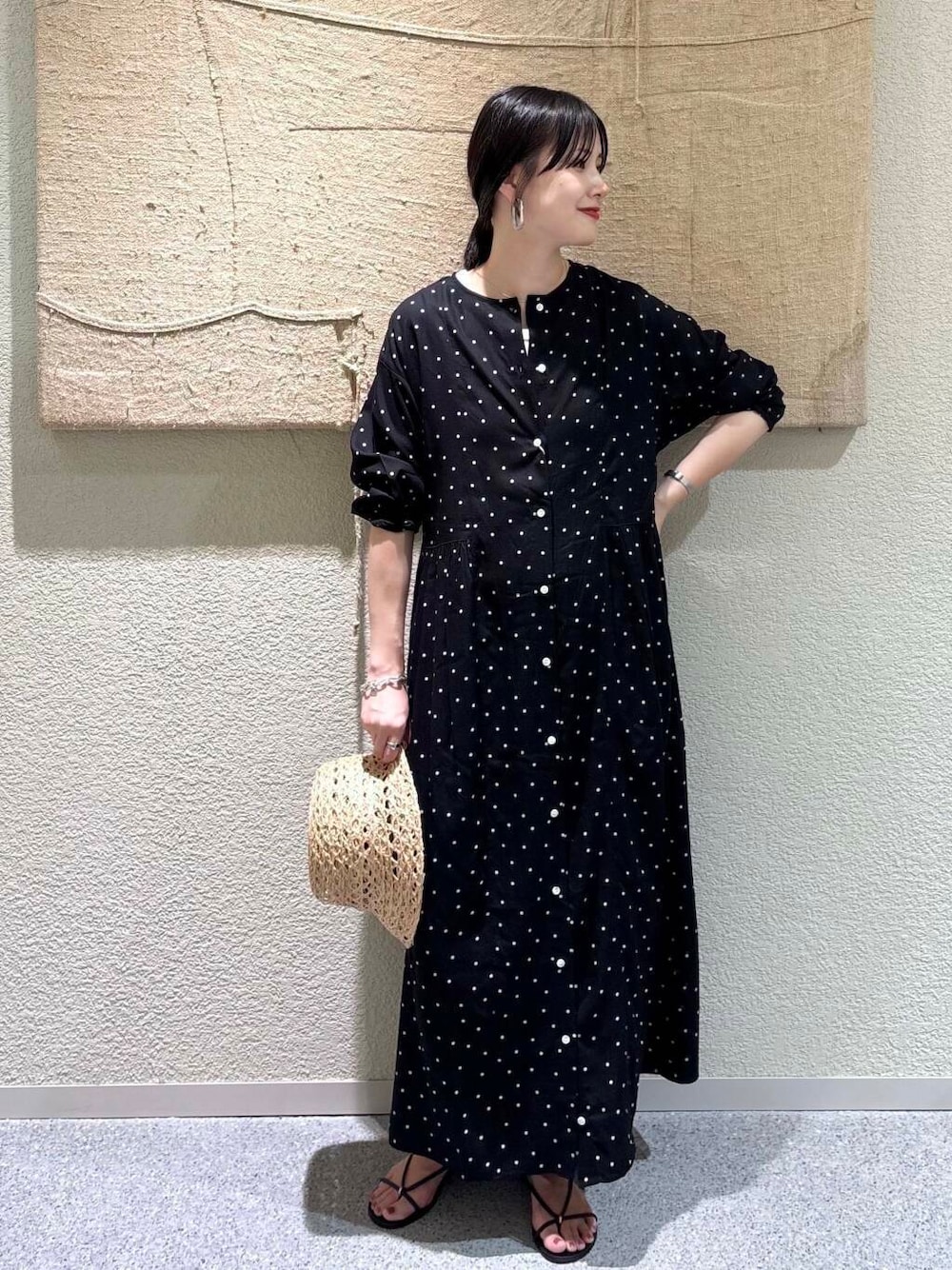 【ワンピース】 小さなドットが程よく甘さを添える、前後2WAY仕様の万能ワンピース。身幅にゆとりがありながらも落ち感のあるシルエットで、リラックス感ときちんと感を両立。 フロントのボタンを2つ外してインナーをチラ見せすることで、抜け感とレイヤードの奥行きが加わり、ぐっと旬な印象に。 【インナー】 ややフィット感のあるシルエットで、重ね着にも最適な一枚。柔らかいコットン素材が肌に優しく、写真では見えづらいですがチラッと見せることでスタイリングに軽さをプラス。 【ハット】 繊細な透かし編みが夏らしい軽やかさを演出。 ナチュラルな素材感と程よい存在感が、コーデ全体を涼やかにまとめてくれます。 【シューズ】 シンプルで合わせやすく、足元を引き締めてくれるモードな黒サンダル。 程よい存在感がありながら、ワンピーススタイルにもなじむ万能アイテム。 ✔️スタイリングポイント • ボタンを開けてタンクトップを見せることで、自然な抜け感をプラス • 細かなドットが甘くなりすぎず、大人の女性らしさを演出 • 透かし編みの帽子と黒小物で、ナチュラルと引き締めのバランスが◎ • 縦のラインが強調されるスタイルアップコーデ