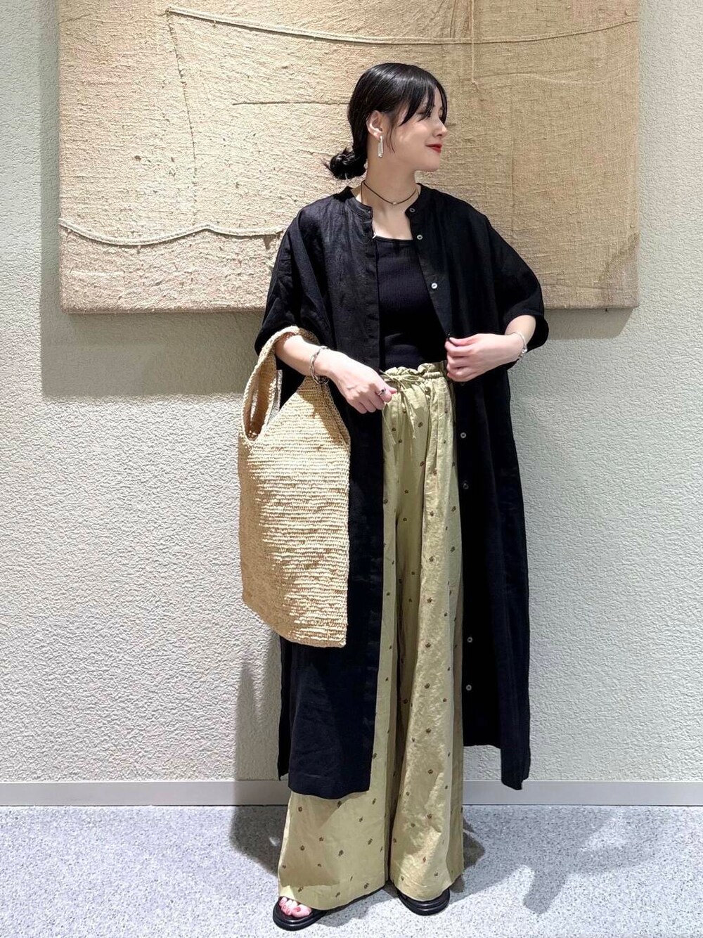 【ワンピース】 スクエアのようなシルエットが印象的なリネンワンピース。デコルテを美しく見せつつ、すとんとしたシルエットが体のラインを拾いすぎず、1枚でもレイヤードでも活躍します。ブラックの色味が、引き締まった印象を与えながらもリネンの風合いで軽やかさをプラス。 【ボトムス】 ワンピースからちらっと見える、小花刺繍のイエローパンツがアクセントとして効いたレイヤードスタイル。刺繍の繊細さと、やさしいカラーがブラックワンピースの引き締まった印象を柔らかく中和してくれます。 【バッグ】 天然素材の温もりを感じるラフィアバッグ。手編みならではの素朴さと、ナチュラルカラーが夏らしさを演出し、リゾート感のある抜け感をスタイリングにプラスします。 【シューズ】 シンプルながら洗練されたダブルストラップデザイン。程よく肌を見せることで軽やかさと抜け感が生まれ、全体の引き締め役としても◎ ✔️スタイリングポイント • 黒ワンピース×刺繍パンツのモノトーン×イエローの絶妙なカラーコントラスト • 裾から覗く刺繍パンツで、さりげない可愛らしさと華やかさをプラス • リネン×刺繍×ラフィアで異素材のミックス感が旬顔スタイルに • 足元をブラックで締めて、バランスの取れたナチュラルモードな着こなしに