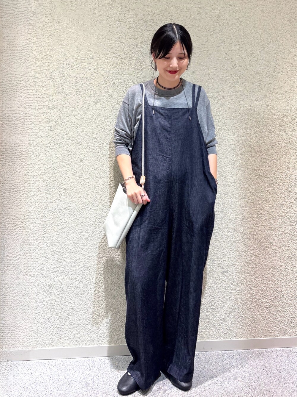 【トップス】 さりげなく透け感のある軽やかな素材が、サロペットのインナーとして程よい存在感をプラス。 【ボトムス】 ゆったりとしたシルエットがリラックス感を演出し、デイリーに着やすい一枚。 【バッグ】 小ぶりなホワイトバッグが爽やかなアクセントとなり、全体を明るくまとめます。 【シューズ】 クラシックなブラックシューズでスタイリングを引き締め、バランスの取れた足元に。 ✔️スタイリングポイント ・グレー×インディゴの落ち着いた色合わせにホワイトバッグを差して爽やかに ・サロペットのカジュアルさを透け感トップスで軽やかにアップデート ・足元はブラックで大人っぽさをプラスし、子どもっぽくならない印象に