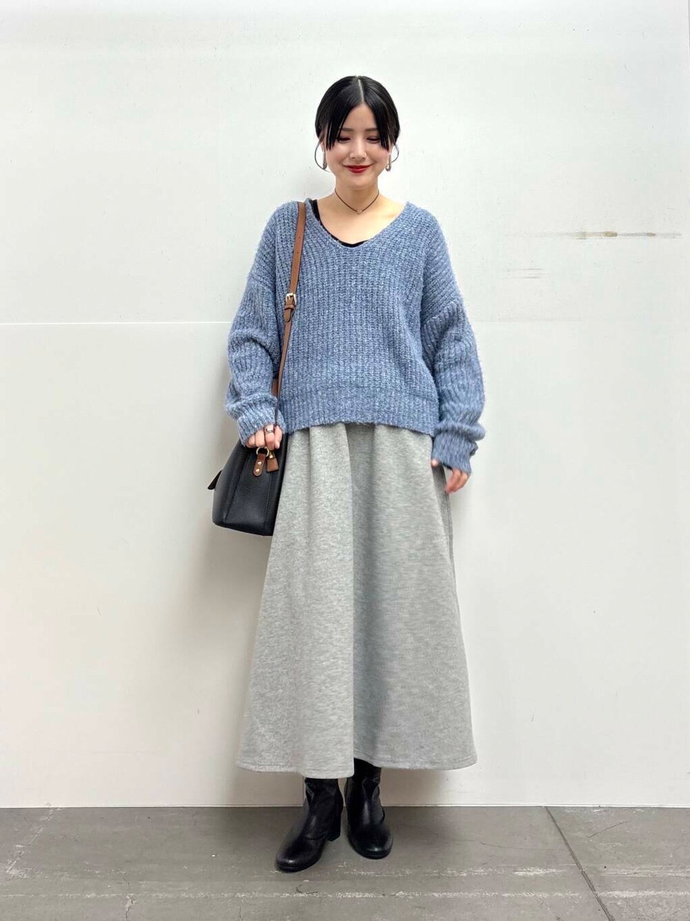 ニットはざっくりとした編み方がカジュアルでかわいいです◎ Vネックなので大人っぽくきれいめmixにも着やすいです♩ スカートは厚手の素材感で温かくお召しいただけます! 丈は身長158㎝でふくらはぎが隠れるくらいの丈感です◎
