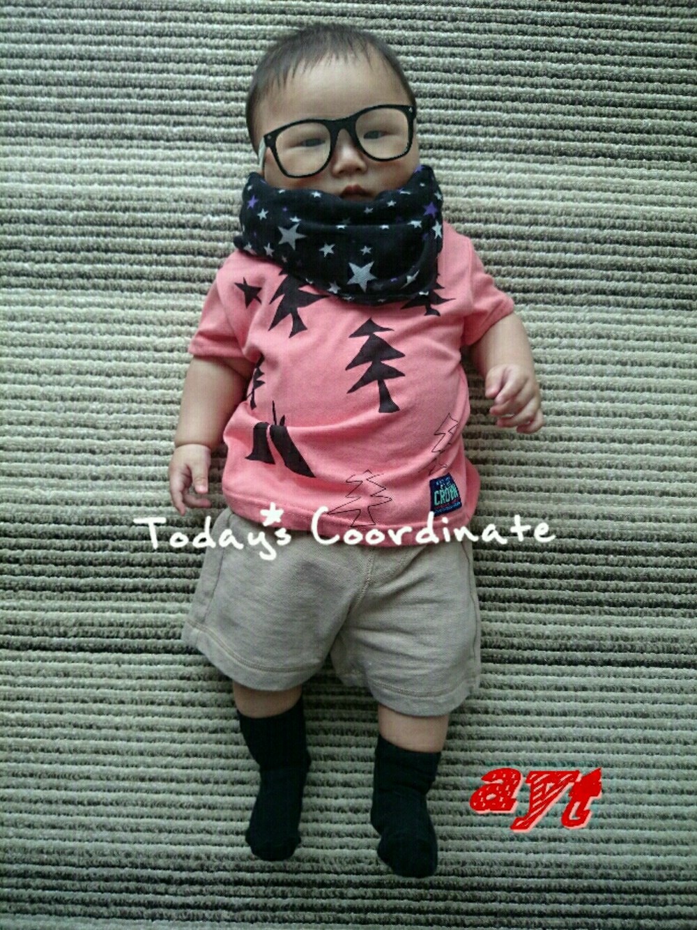 今日は黒縁メガネに初挑戦 ٩(*>▽<*)۶ 思ってたよりも嫌がらなかったから良かった ( •̀∀•́ )✧ Tシャツはうーたん☁くんが着てて、かわいいなぁ💕ってチェックしてたのがサイズもばっちりで売ってたので真似っこさせてもらいました😍💕 Tシャツに☆も入ってたから、それに合わせて☆柄ストールで😁✌✨✨