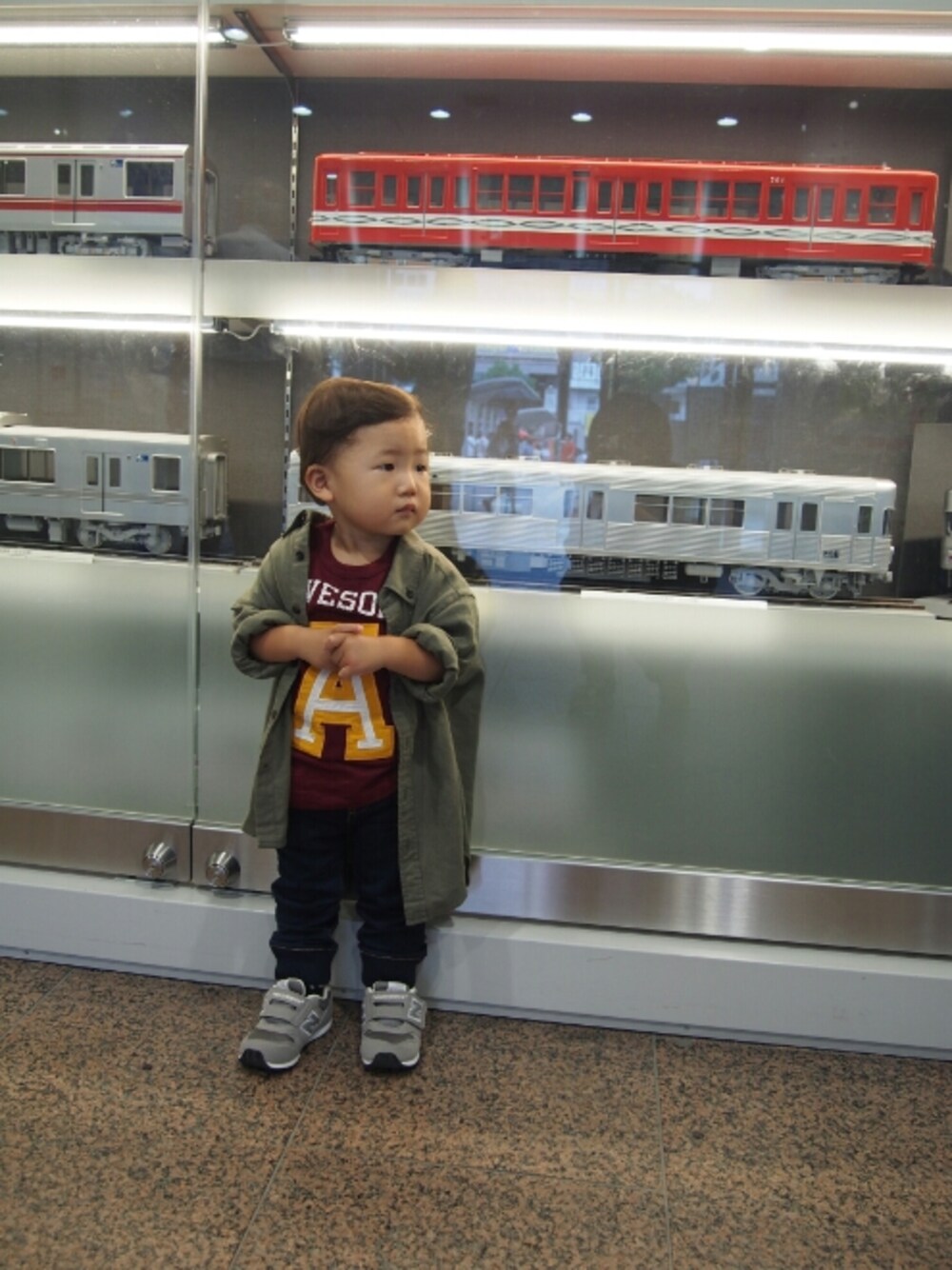 この前行った地下鉄博物館の時のコーデ╰(*´︶`*)╯♡ UNIQLOのシャツは、110だから大きいけど、ロングシャツになって個人的には好き😁💕 イニシャルAを見つけると買わずにはいられない(/´△`\)💕笑 電車オタクのあやとは、大興奮でいろいろ探検して、あやと語でめっちゃ解説してくれた😂💦⤴⤴ 早くお話しできるようになるといいな😂✨⤴⤴