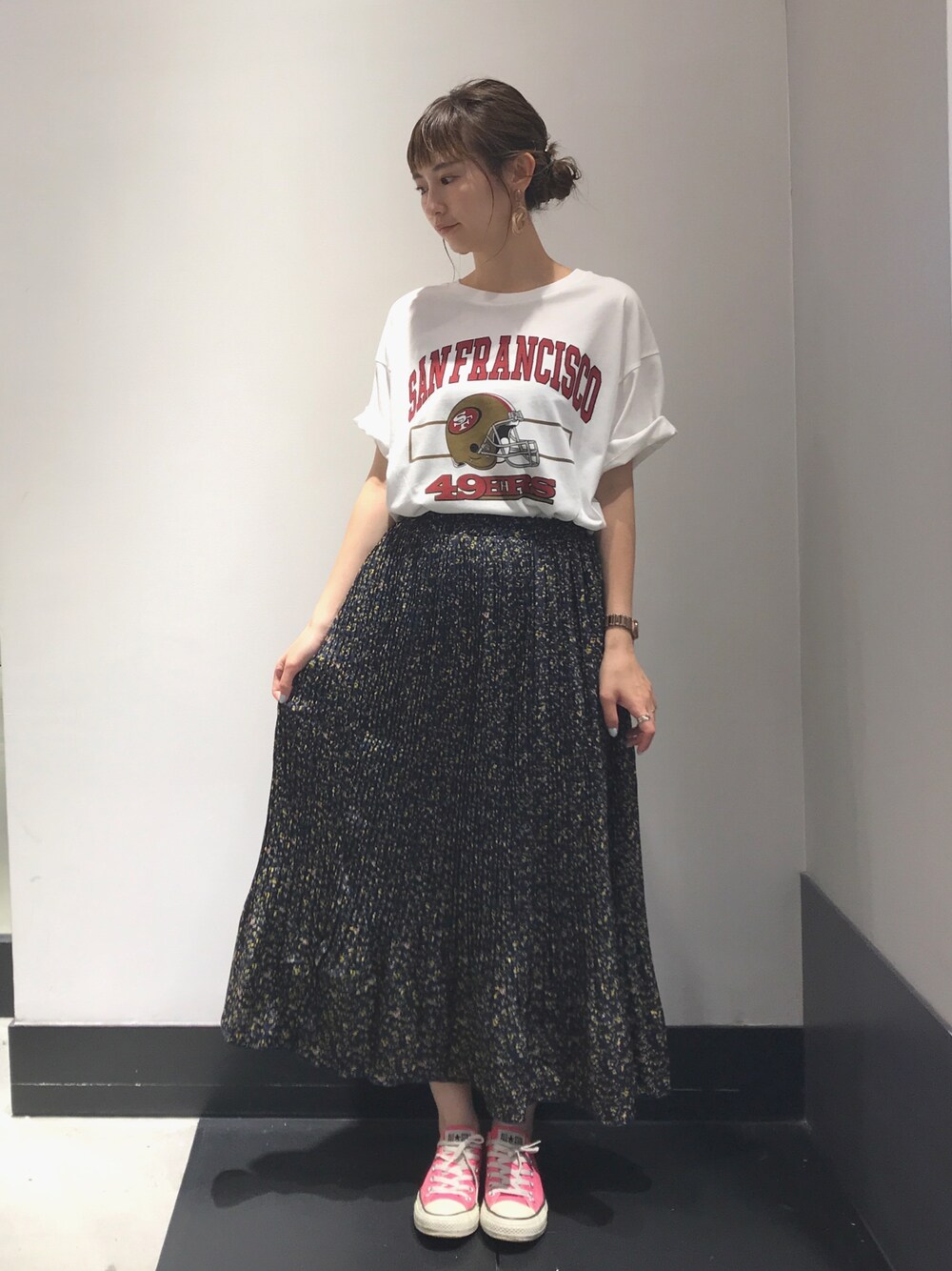 ロゴTと花柄スカートコーデ🍒 フレアスカートは涼しいので暑いこの時期におすすめです☝︎