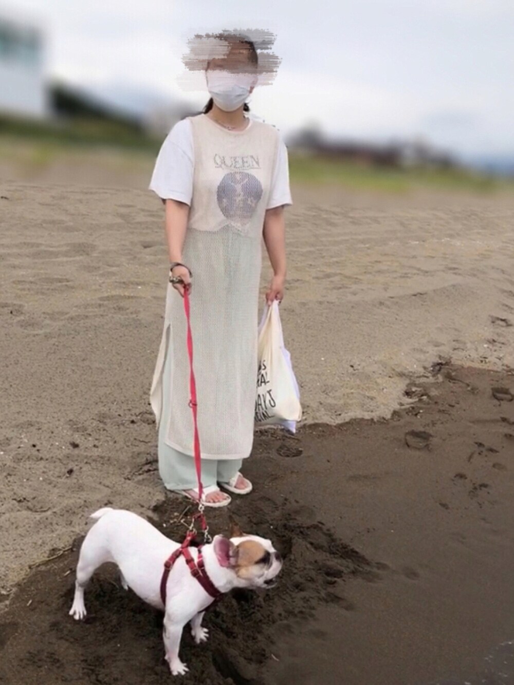 いつもありがとうございます♪😊♪ お散歩コーデ🚶♀️ この日はどんより天気でした 途中から雨降ってきたし☔️ うちの犬は波の泡を食べようとします🐷