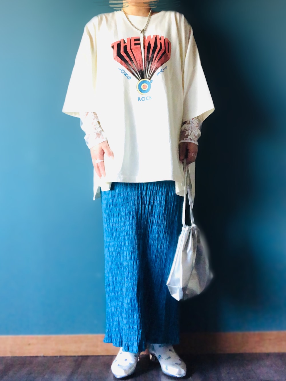 おはようございます☀ 本日のコーデのポイント✌️ ★ブルーのスカート 綺麗なブルーでお気に入り ★ロックTに花柄シアーシャツ まだ寒いのでレイヤード🥞 ★クリアサンダルに花柄靴下 柄に柄でくどい 以上です🎤 いつも閲覧ありがとうございます♪😊♪