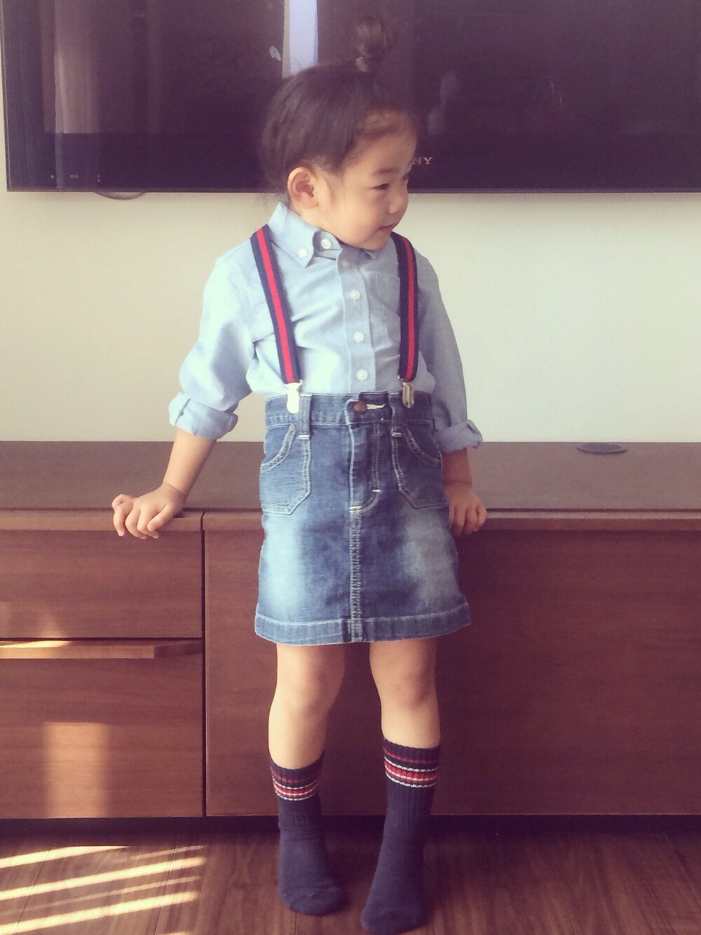 シャツ・靴下:西松屋 サスペンダー:ダイソー スカート:古着(Lee) プチプラコーデ☆☆